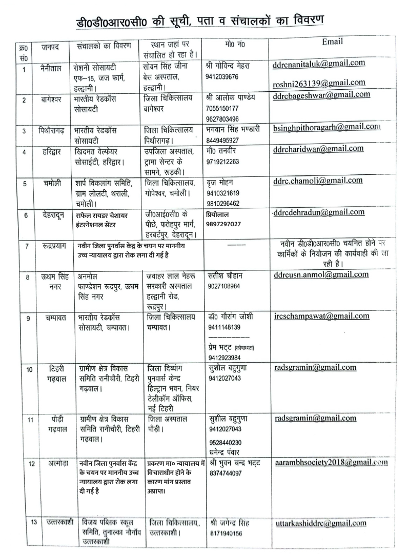 | 2 | श्रीमती ललिता पाण्डे | मुख्य प्रशासनिक अधिकारी | 7579002130 | 12 तिलक रोड, नियर बिन्दाल ब्रिज, देहरादून, उत्तराखंड | | cduttarakhand@gmail.com |
